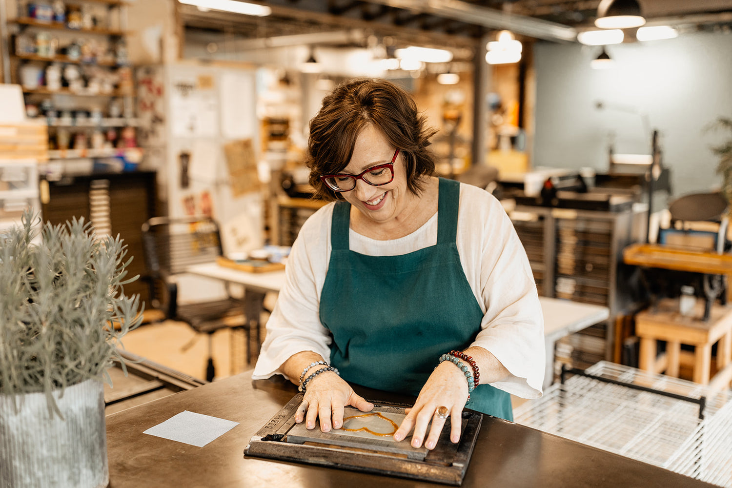 In September 2023, Theresa launched Open to Being, a boutique letterpress stationery and art studio with a vision of a more compassionately connected world. She designs and prints elegant letterpress paper goods, stationery, and artwork for heart and soul. She works out of her Arlington studio as well as at Pyramid Atlantic Art Center in Hyattsville, MD.